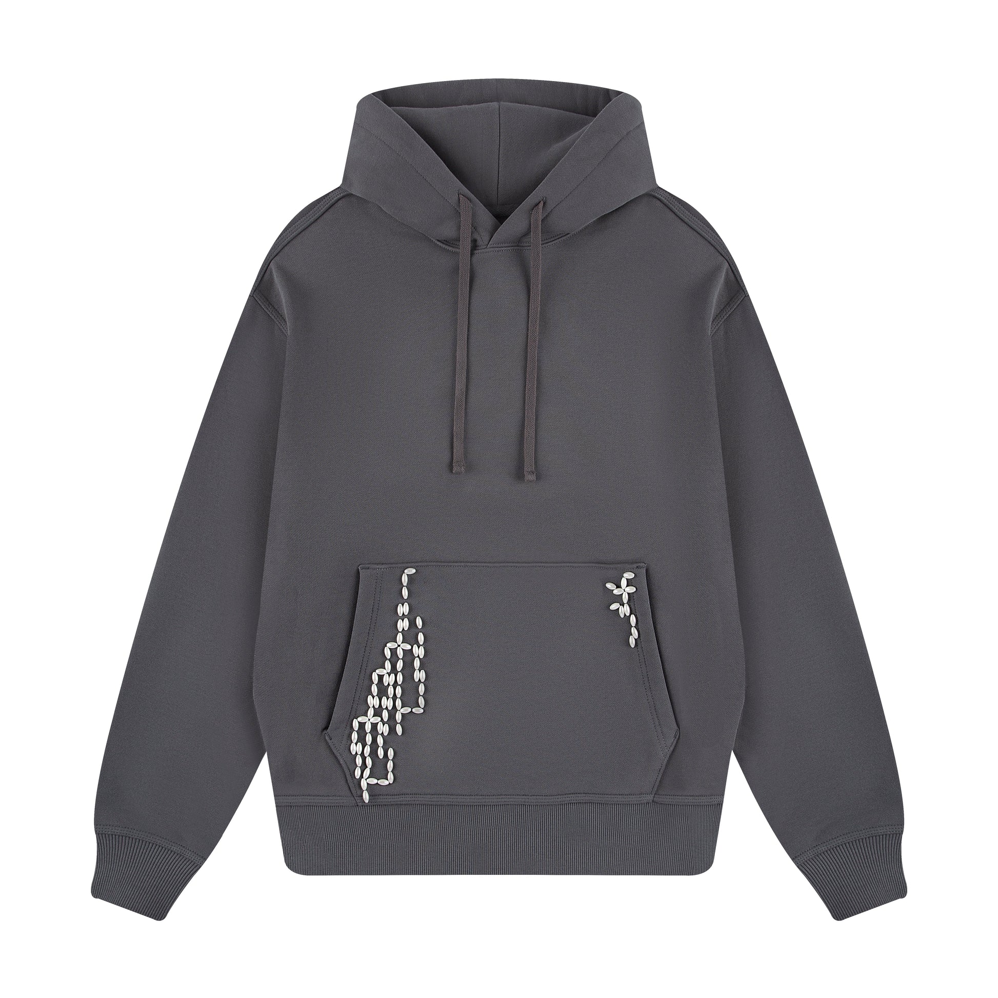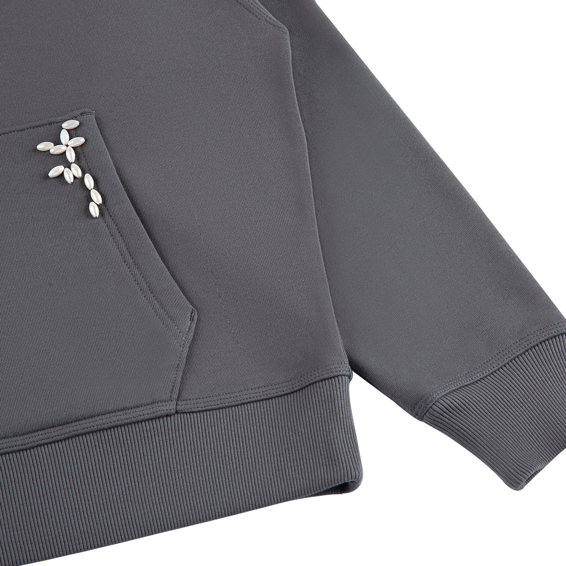 480gsm/ 100% preshrunk cotton/ embroidery on back/ hand embroidered pearl detail on front pocket/ fits true to size