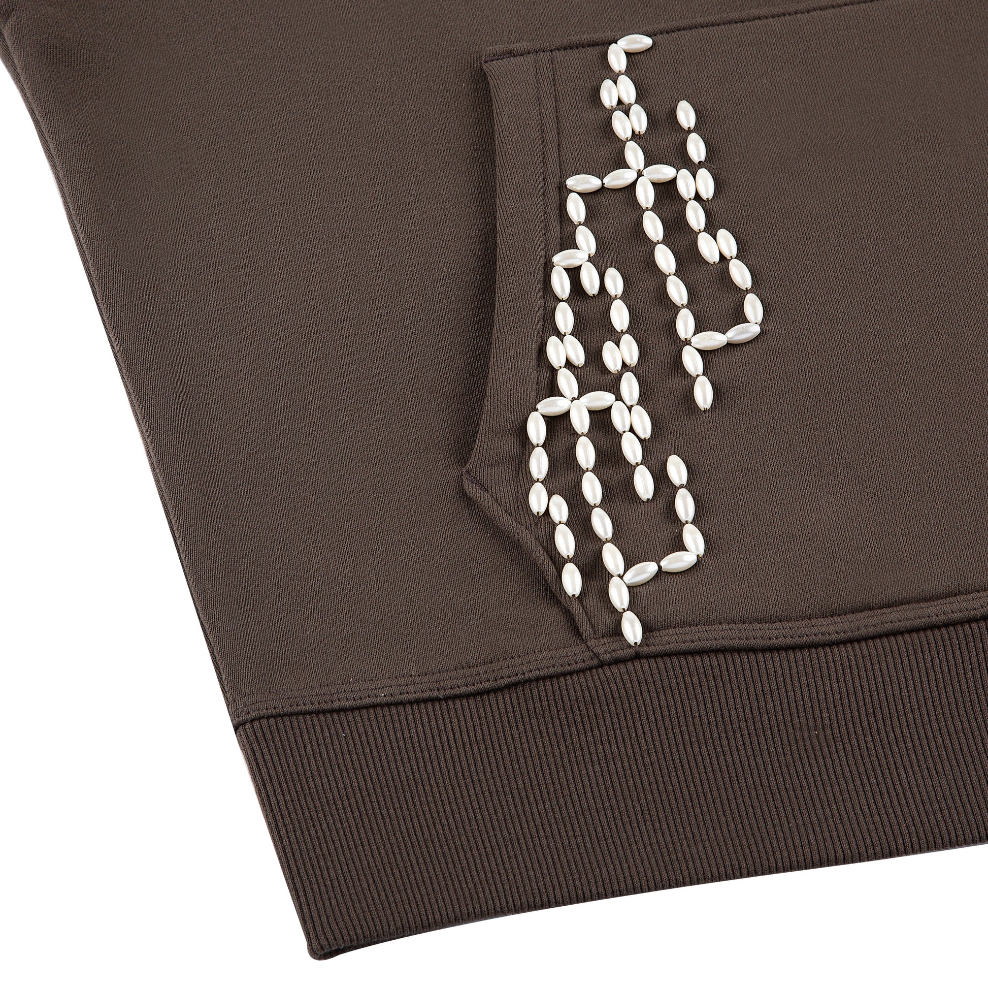 480gsm/ 100% preshrunk cotton/ embroidery on back/ hand embroidered pearl detail on front pocket/ fits true to size