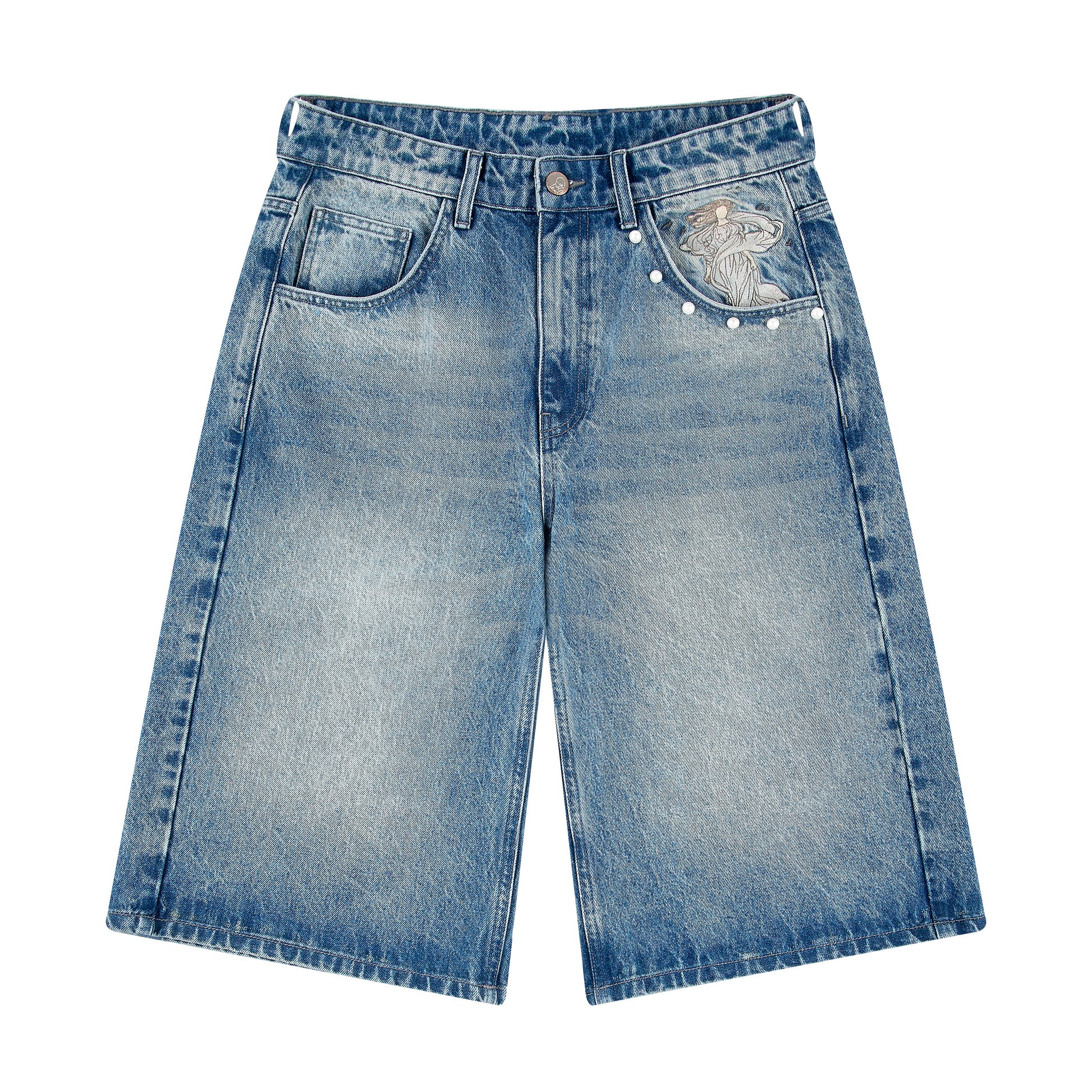 14,5oz denim/ 100% cotton/ embroidery on front/ pearl details/ baggy fit