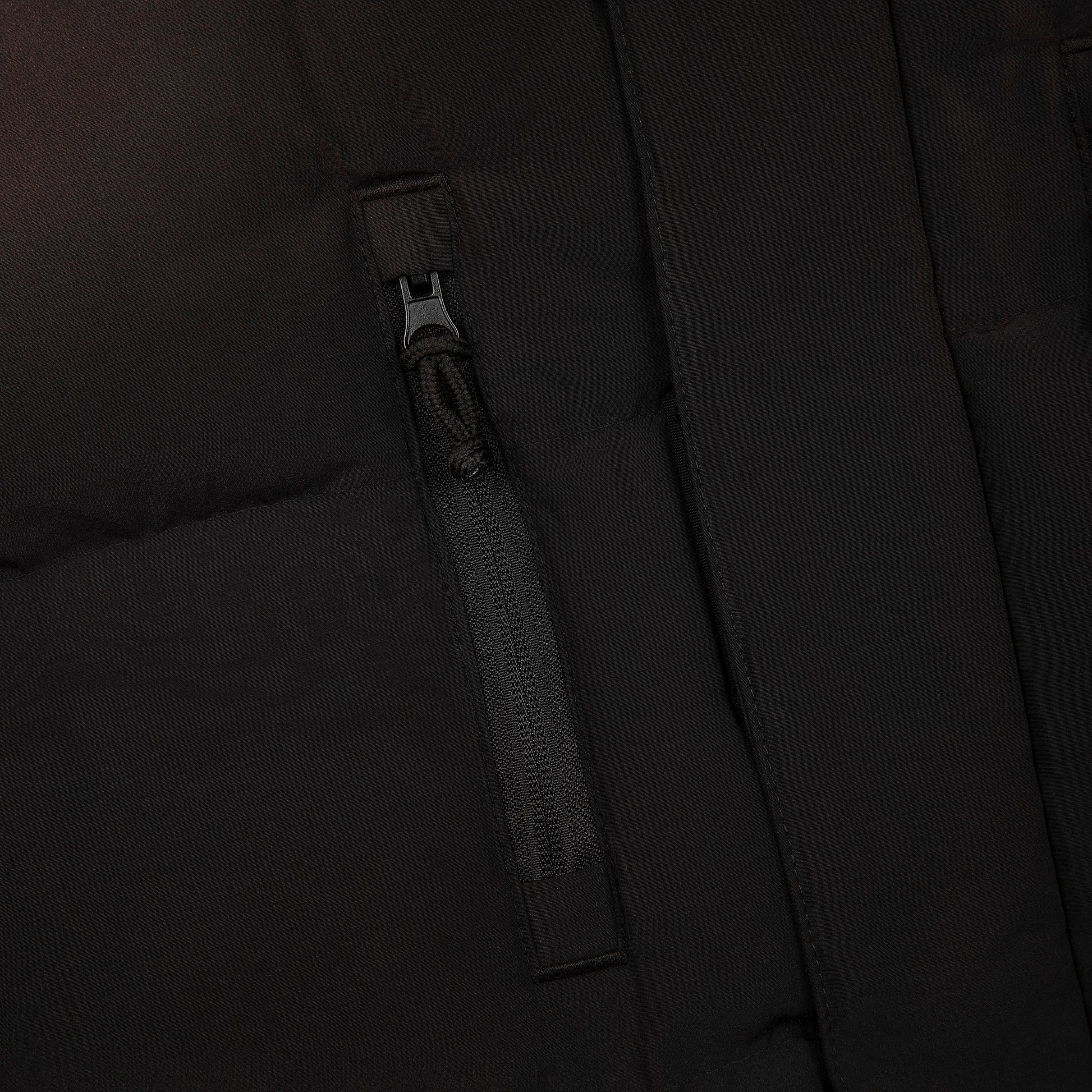water repellent fabric / 50/50 polyester cotton blend / micro gel filling / embroidery on sleeves, front and back / very light spray effect in dark red ?/ adjustable waistband / ?fits true to size