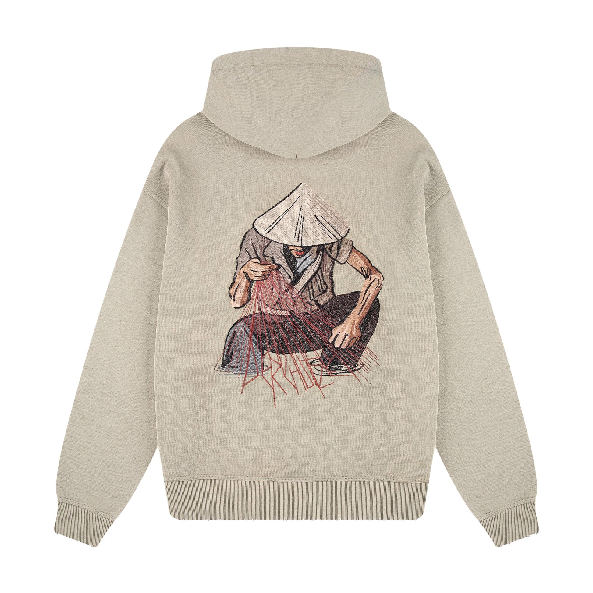 480gsm French terry / 200 000+ stitches embroidery on back / 100% preshrunk cotton / washed effect / reverse fabric panel / embroidery on back / fits true to size