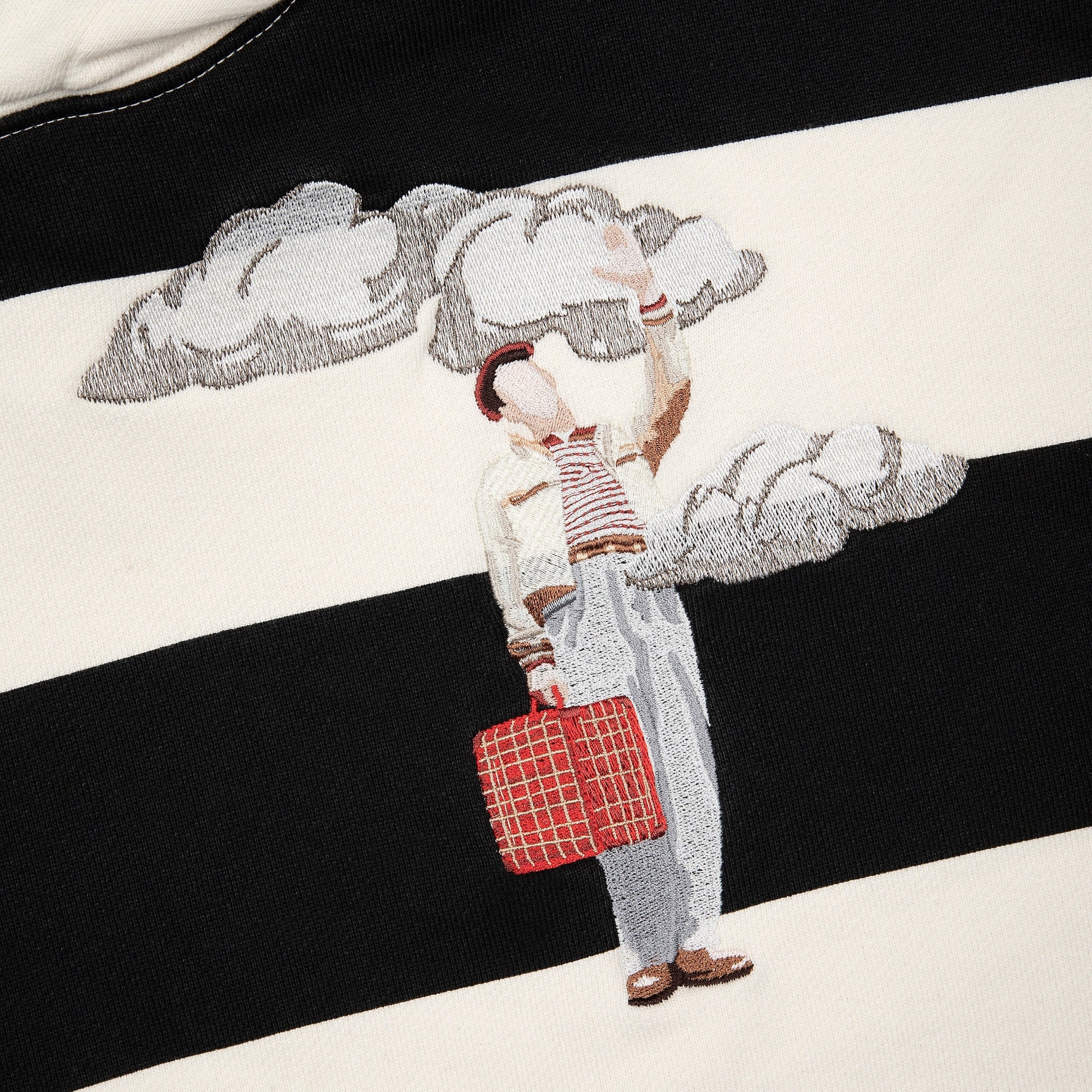 460gsm / 100% preshrunk cotton / navy printed stripes on ecru fabric (wash and iron inside out at low heat) / embroidery on front / fits true to size?