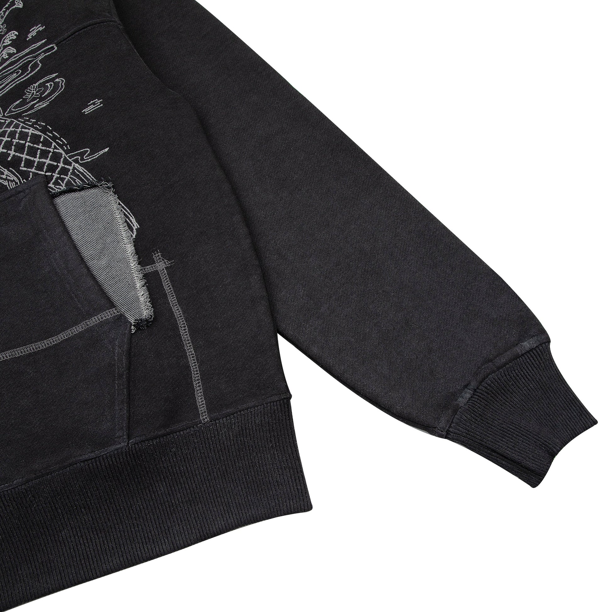 480gsm french terry/ 100% preshrunk cotton/ YKK zipper/ flatlock stitching/ embroidery and denim patchwork on front / fits true to size
