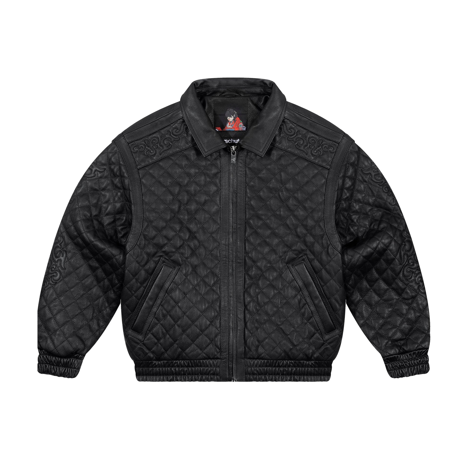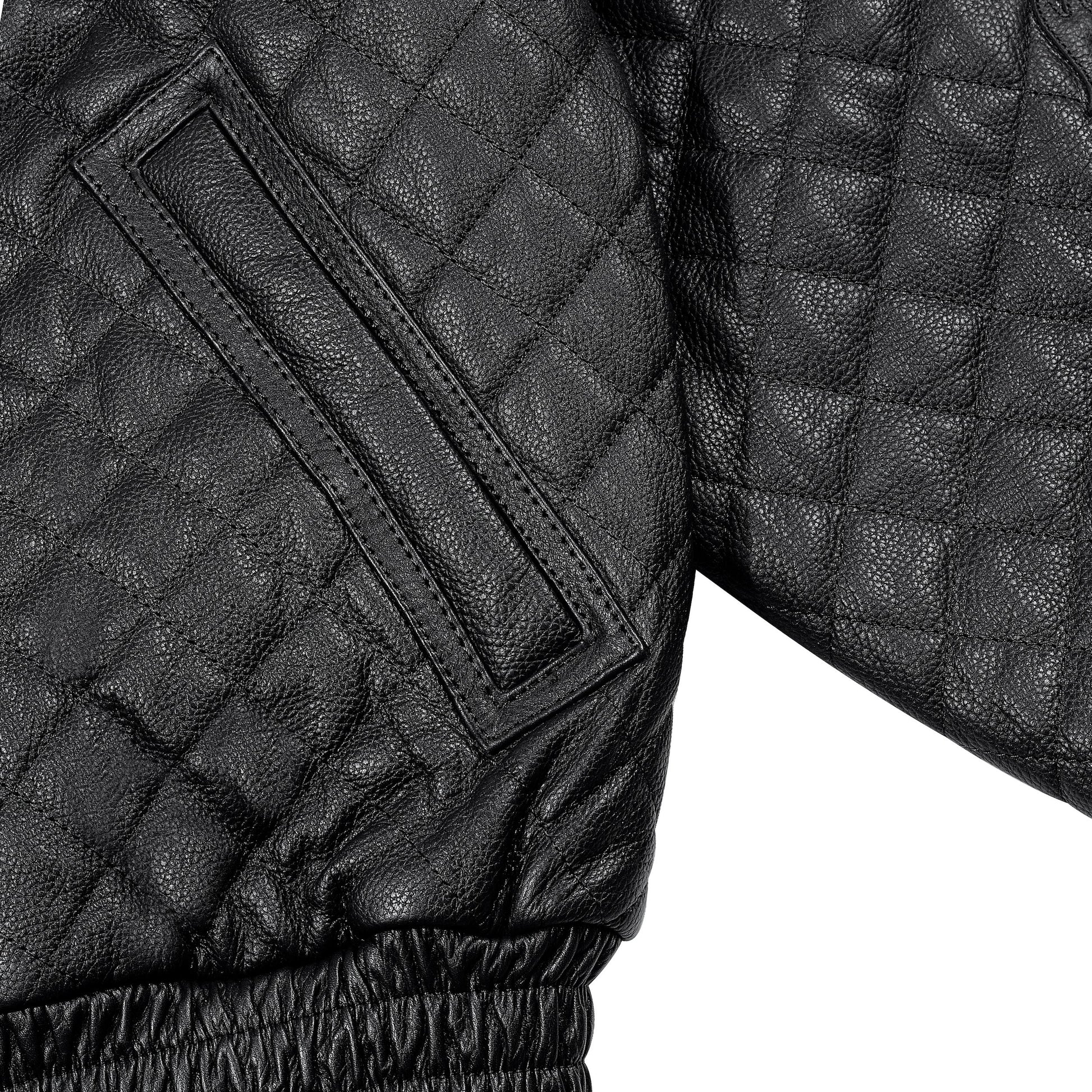 heavy real cow leather / 100% Polyester?Inner linning / YKK zipper / embossed back design / quilted sleeves?