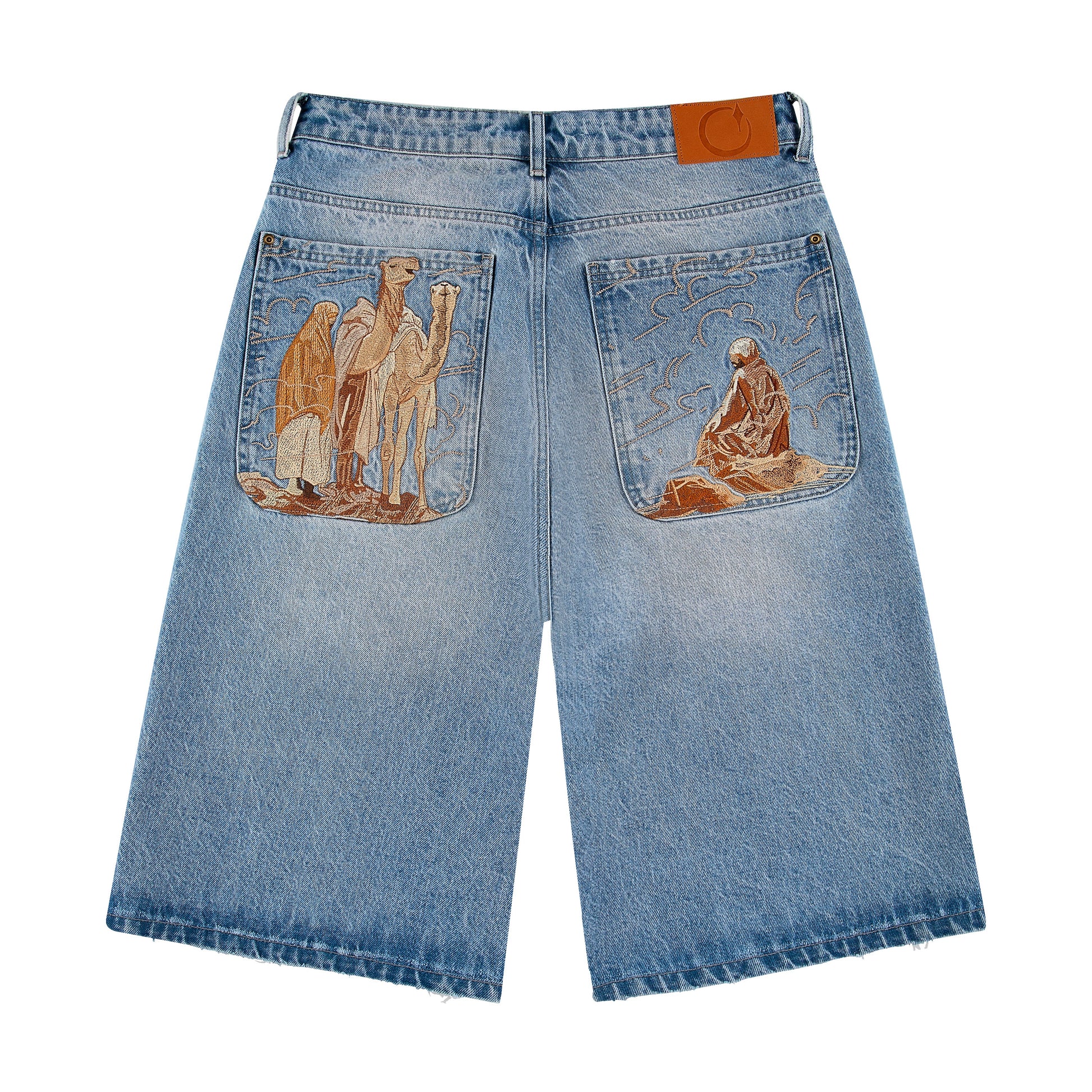 14,5 oz denim / 100% cotton/ embroidery front and back details/ leather patch on back/ over knee baggy fit